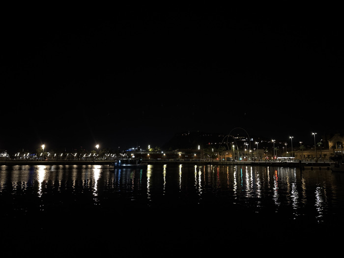 A nighttime view of a waterfront city. The dark water reflects a series of lights lining the shore. Streetlights and building lights create vertical streaks in the water. A boat is visible, closer to the center of the frame. The sky is black, with a few barely discernible stars. In the background, faint hills and arch structures add depth. The overall scene is illuminated by the city's lights, casting a serene atmosphere.