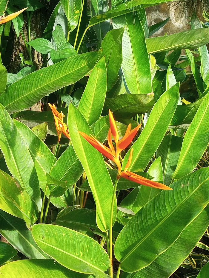 Bright green, elongated leaves dominate the frame, their parallel veins prominent. Two vibrant orange Heliconia flowers stand out against the green foliage. One flower is fully open, its petals radiating outward, while the other is still in bud, partially obscured. The composition is dense, with overlapping leaves creating a sense of depth and lushness. Light filtering through the leaves adds contrast and highlights textures.