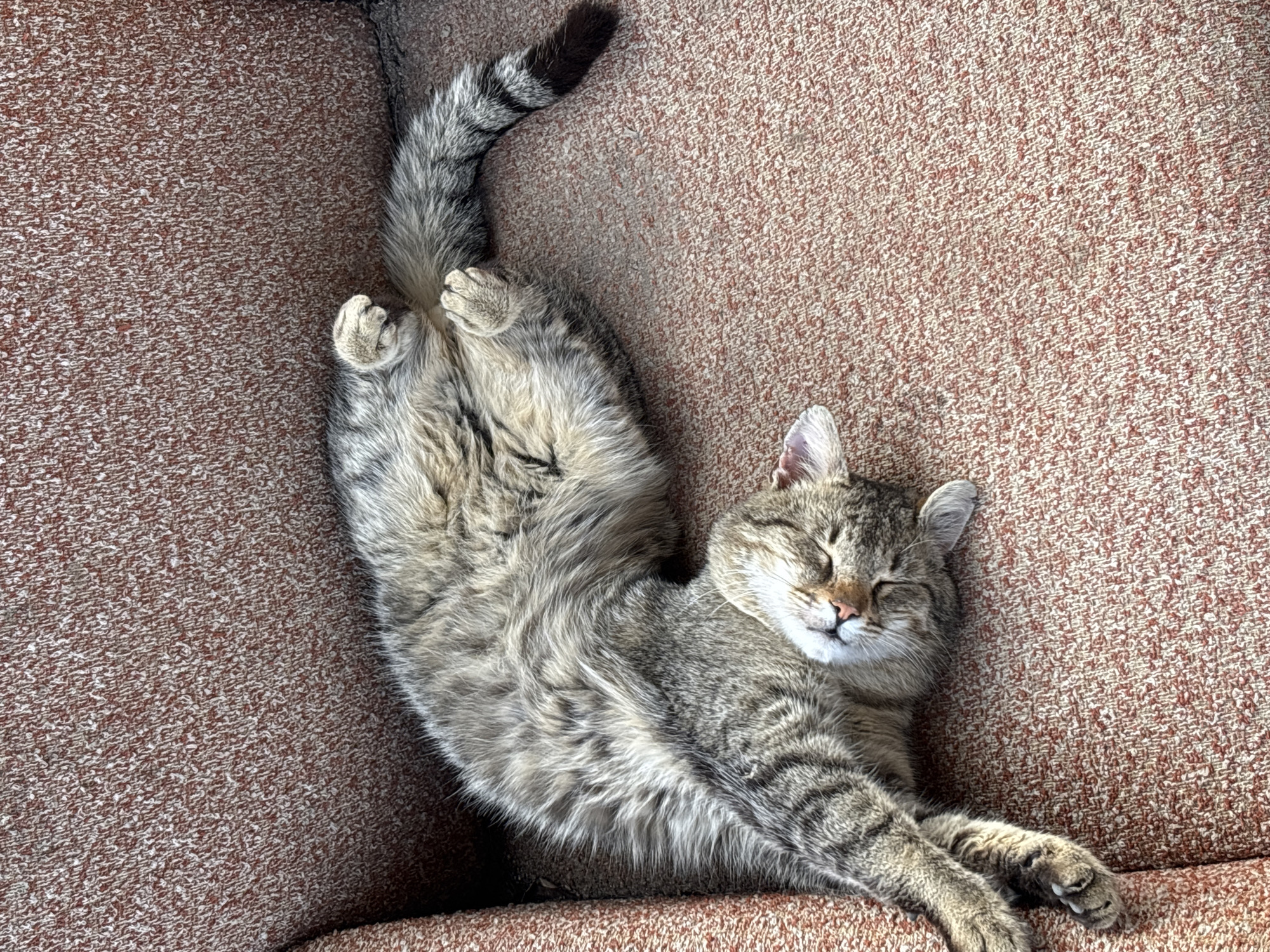 In Slavyanovo, Bulgaria, a domestic tabby cat is depicted asleep on an upholstered furniture surface. The cat, exhibiting grey-brown fur with distinct darker stripes, is positioned on its back, stretching its limbs upwards with paws curled. Its eyes are closed. The striped tail, with a darker tip, is visible. The supporting surface consists of a reddish-brown, flecked, woven upholstery material, consistent with an indoor sofa or armchair.