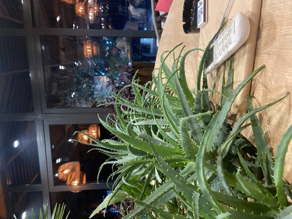 Aloe vera plants stand prominently, their spiky, green leaves filling the frame. They are placed on a light brown, wooden-like surface. Behind the plants, a window reflects various light fixtures and hints of activity, suggesting an indoor space possibly at night. A remote control and a small, dark rectangular object also rest on the surface alongside the plants.