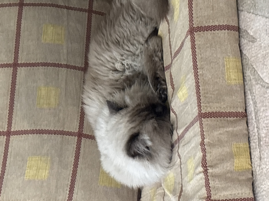 A long-haired domestic cat, exhibiting point coloration with a cream-colored body and dark brown markings on its face, ears, and paws, is observed sleeping in a curled-up posture