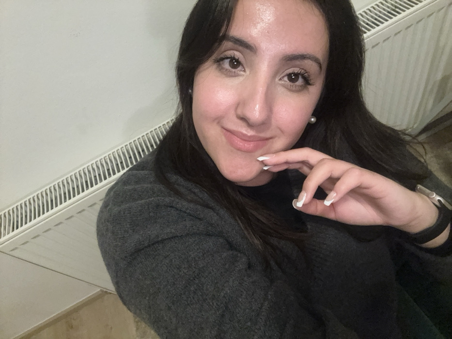 A woman with dark hair and light skin is posing indoors. She is wearing a dark grey sweater, a black top, and pearl earrings. Her nails are manicured with white tips. She has a small smile and is looking at the camera. Her left hand is raised, with her fingers near her chin. A white radiator is visible in the background on the left side of the image. A black watch is visible on her wrist.