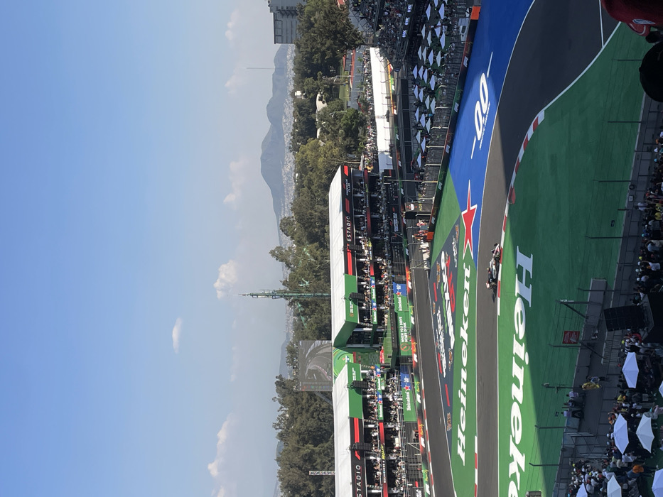 The image depicts an aerial view of a Formula 1 race circuit, specifically the Autódromo Hermanos Rodríguez in Mexico City, Mexico, during a bright, sunny day