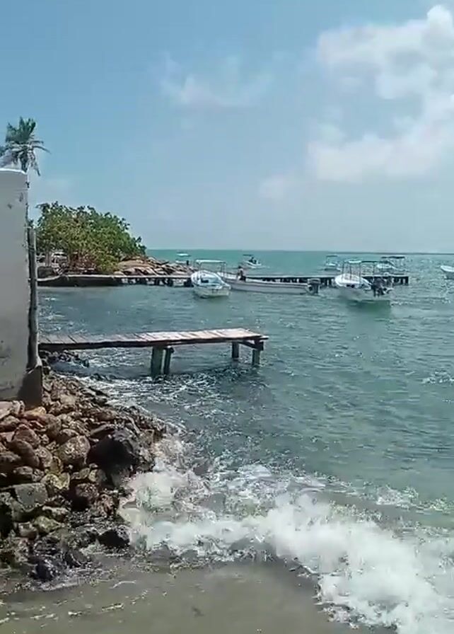 scene at a rocky beach on a sunny day. The water is choppy, and there are several boats docked at wooden piers in the distance. Closer to the camera, waves are crashing against the rocks. The camera pans to the left to reveal two children playing in a small pool of water formed by the rocks and the incoming waves. They are splashing around and appear to be enjoying themselves. The camera pans back to show the boats and the overall beach scene again.