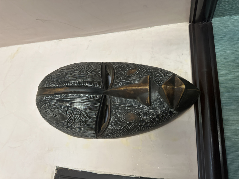 An elongated, dark, stylized mask is mounted vertically on an off-white, textured interior wall