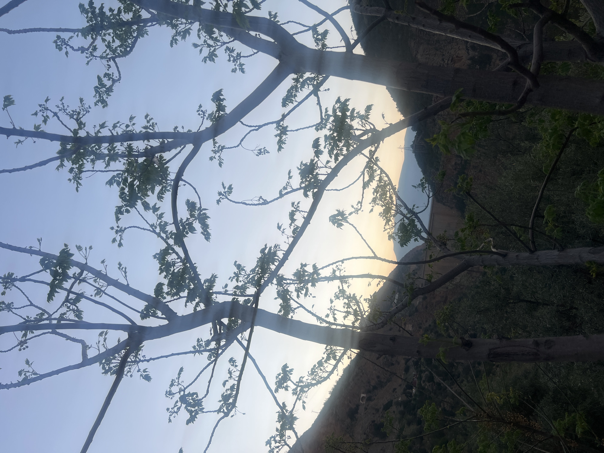 view framed by tree branches with emerging leaves, against a background of mountains and a hazy sky, likely taken during sunset or sunrise