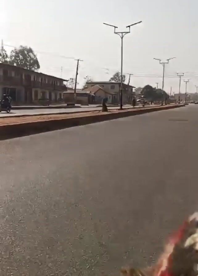 A first-person perspective video shows a wide asphalt road under a hazy sky