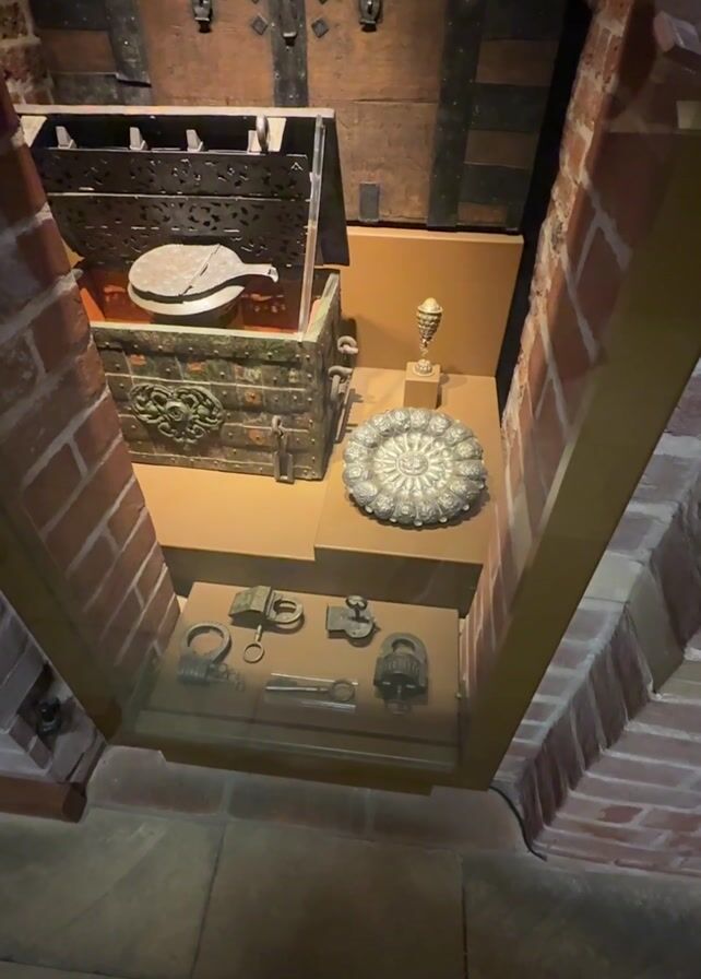 display case built into a brick wall, filled with antique items. The top level features two large, dark chests, one partially open revealing a wooden box inside. The middle level displays a large, circular, possibly silver, plate with an intricate floral and animal design, and a small golden goblet on a pedestal. The bottom level contains an assortment of old locks and a key. The camera zooms in on the silver plate, highlighting its detailed design. The scene is dimly lit, creating an atmosphere of age and history. There are no people visible in the video.