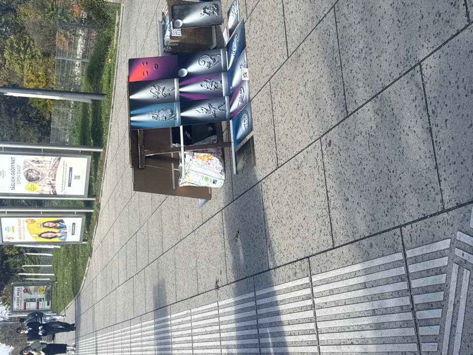 The image depicts a street scene in Vienna, Austria, specifically near the Rochusmarkt area or a U3 metro station, as indicated by visible advertising. In the foreground and mid-ground, a makeshift outdoor art vendor display is set up on a grey concrete slab sidewalk. Multiple artworks, predominantly rectangular spray-painted pieces featuring stylized human-like figures or faces under colorful spotlights (blue, pink, red, purple, white), are arranged for sale. Some are displayed vertically on a brown wooden easel-like stand, while others are laid flat on the pavement, one with a "10€" price tag. A white shopping bag with a floral pattern is positioned next to the stand, and additional art pieces are visible in cardboard boxes. On the left side of the sidewalk, a tactile paving strip with white parallel raised lines runs longitudinally. In the upper left quadrant, two individuals are walking away from the camera: one wearing light-colored attire and dark trousers, and another in a dark suit jacket and trousers. A third, partially obscured person is further behind them. Adjacent to the sidewalk, across a narrow grassy median with trees displaying autumnal foliage, stand three prominent advertising billboards. The leftmost billboard advertises a "CLASSIC PASS" with an image of a tram. The central billboard features two individuals and text related to "Rochusmarkt." The rightmost billboard displays "TÄGLICH GEÖFFNET OPEN DAILY," an interior image, and text identifying the "Kunsthistorisches Museum Wien" along with its website and a QR code. A metal fence runs behind the grassy area. The scene is illuminated by direct sunlight, casting shadows on the pavement.