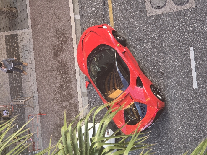 - "An aerial view shows a vibrant red sports car parked on a grey asphalt street with a white line marking" by FM-0E3qg2, licensed under CC BY 4.0