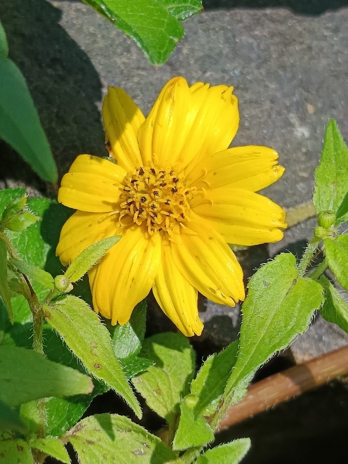 A single yellow flower, resembling a daisy or coreopsis, is centrally positioned. It features approximately ten bright yellow petals, some exhibiting minor imperfections or dark specks. The flower's center is composed of numerous small, dark brown or black disc florets. Surrounding the flower are several green leaves with serrated edges and visible hair-like structures, some appearing out of focus. The background is dark and indistinct, suggesting an outdoor setting with uneven ground or a wall. Direct sunlight illuminates the scene from the upper left, casting shadows beneath the leaves and on parts of the petals. No people, animals, or artificial objects are present. No specific actions or interactions are depicted. The precise location within Ouderkerk aan de Amstel, Netherlands, cannot be determined from the visual evidence in the image.
