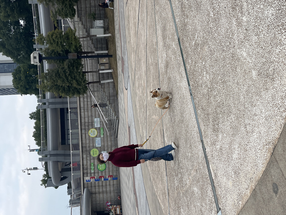 The scene depicts a pedestrian plaza in Banan, China, under an overcast sky. In the foreground, an adult female with short dark hair, wearing a white face mask, a dark red high-neck sweater, blue wide-leg jeans, and white sneakers, walks a tri-color Pembroke Welsh Corgi. She holds a yellow leash in her right hand, connected to the dog's collar. Both subjects are proceeding leftward across a light-colored, speckled paved surface that features dark linear markings. In the mid-ground and background, a multi-level architectural complex is visible. This includes a raised, curved concrete walkway or platform supported by grey pillars and railings, with green foliage on its upper surface. Below this, a light-colored brick retaining wall displays several vertical blue 'E' shaped markings. Multiple flights of concrete stairs with metal railings ascend this wall. A utility pole with a white box-like sensor and two grey ground-level utility boxes are situated near the staircases. Small trees with green leaves are planted along the base of the retaining wall. One individual is observed ascending the stairs, and another person is seated on a bench or low wall in the far right background. A tall, modern building with dark windows is partially visible above the distant tree line. Small market stalls or merchandise displays are present near an entrance on the far left of the background structure.