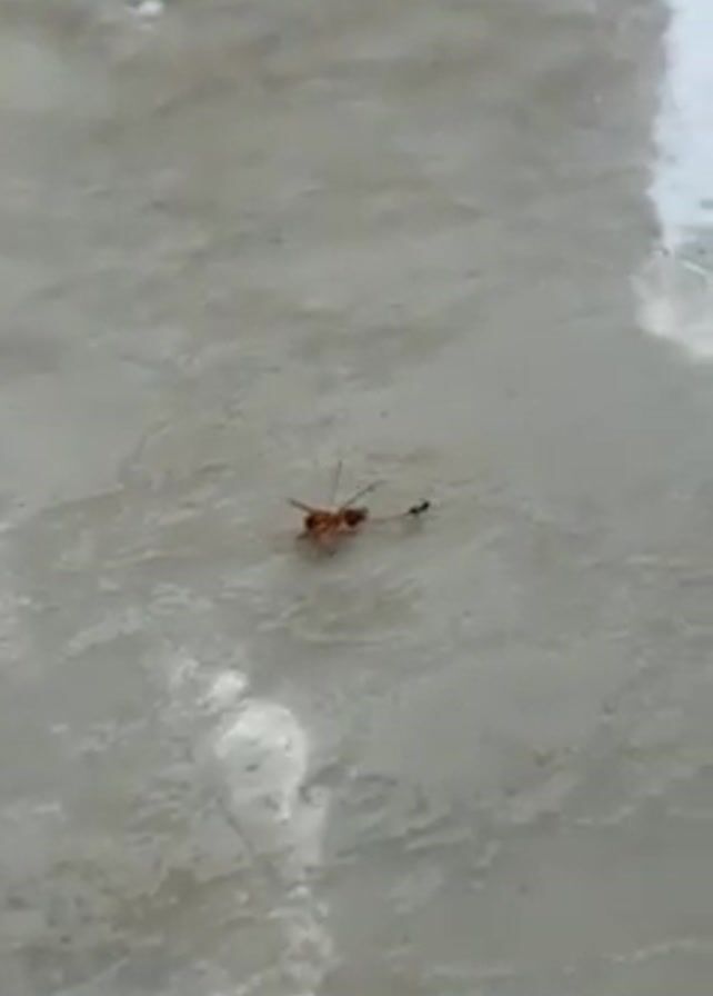 red ant lying still on its back on a gray and white marble-like surface. Next to it is a small black ant. The red ant appears immobile, while the black ant is moving slightly. The surface reflects light, suggesting it is polished.