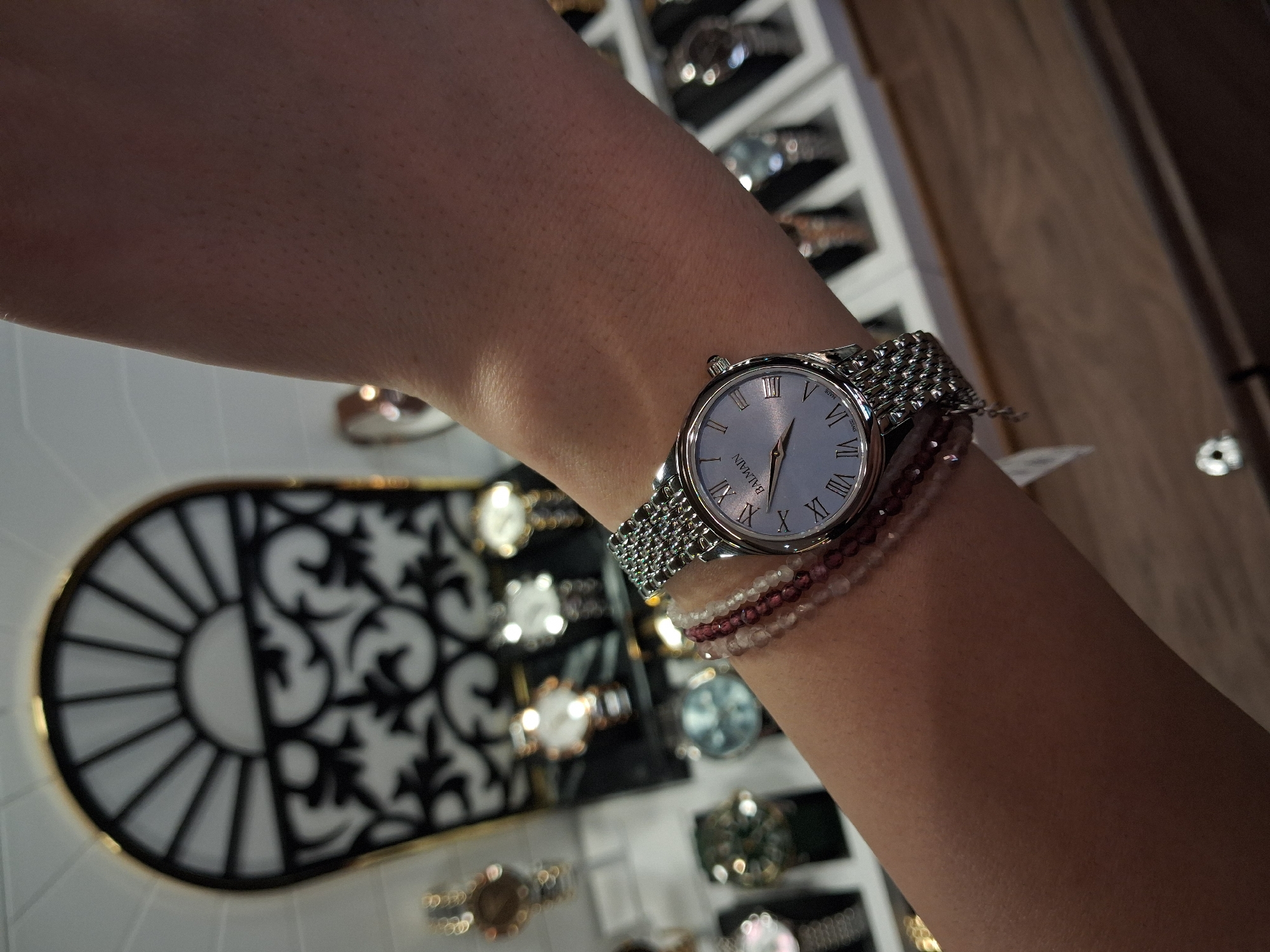 A person's left wrist and forearm are the primary focus of the image, with a wristwatch and several beaded bracelets worn on the wrist. The wristwatch is round with a silver-toned case and a mesh-like silver band. The watch face has Roman numerals. Below the watch are several beaded bracelets, one primarily white and another with mixed white and red beads. In the blurred background, an ornate black and gold decorative element is visible, along with a display case containing numerous wristwatches. The watch display case suggests the setting is likely a watch shop. Given the mention of Varna, Bulgaria, it can be inferred the location of the image is likely in a watch store or a retail establishment selling watches and jewelry in the city of Varna.