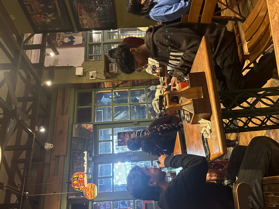 People are sitting at tables in a restaurant. The tables are wooden, and some have unique wooden structures on them. One person is wearing a black sweater and jeans, and another is in a black hoodie. Decorative lamps hang from the ceiling. Windows and vintage posters adorn the walls, suggesting an eclectic decor. Some people are focused on their phones.