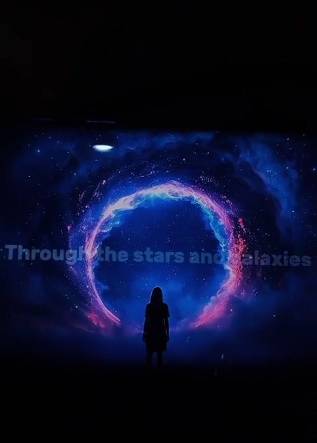 television screen in a dark room. On the screen is an animated image of a person silhouetted against a background of a swirling galaxy. The lyrics "Gravity, you're pulling me through the stars and galaxies. Even when I fall apart" are displayed in white text on the screen.