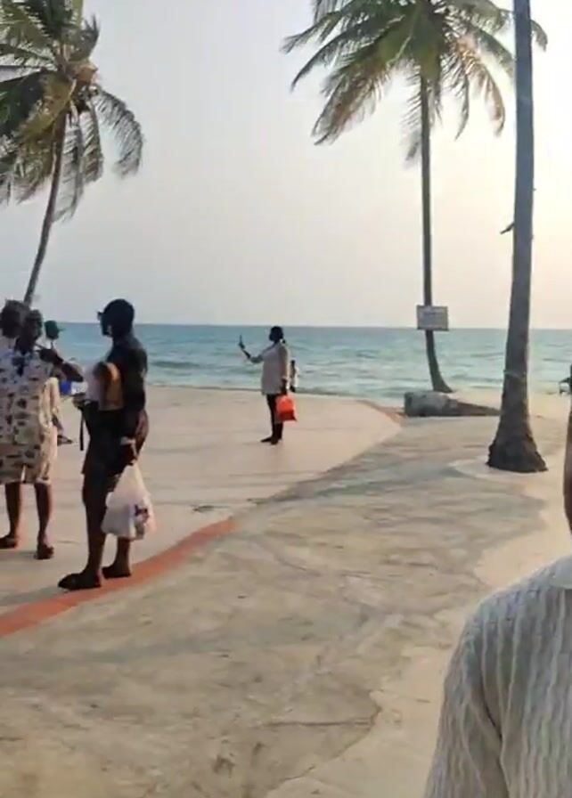 The video showcases a lively beach setting, probably in the tropics, with numerous palm trees lining the shore. The initial shot is of a man standing on a paved walkway, with the ocean and beachgoers visible in the background. As the video progresses, it pans to reveal a bustling scene of people walking, carrying items, and seemingly enjoying themselves. The presence of speakers suggests music is being played, contributing to the festive atmosphere. The focus shifts to two men dressed in matching colorful outfits, standing near a table. Overall, the video captures a vibrant and social beach environment.