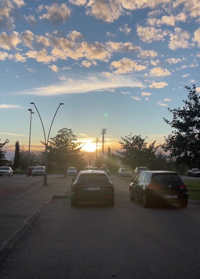 parking lot with cars and a dramatic sunset with a blue sky filled with puffy clouds. The sun is low on the horizon, shining between trees and a stadium light tower. The camera then pans to show a road leading toward two modern, mirrored buildings. Mountains are visible in the background, and the sky is a mix of blue and pink clouds. There are street lights and sidewalks along the road. A sign that says "HVALA VAM" (Thank You) is visible on a building to the right. The scene is peaceful and serene.