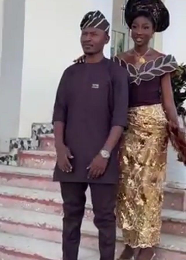 A man and a woman stand on a staircase in front of a white building, posing for photographs. The man is wearing a brown, patterned hat and a matching brown outfit. The woman is wearing a dark brown top with golden embellishments, a gold, sequined skirt, and a dark-colored head wrap. She is also holding a matching fan. The staircase has a pattern of black and white tiles. The building has multiple windows. A person holding a camera stands off-screen to the left. A potted plant sits on the bottom stair to the left of the couple.