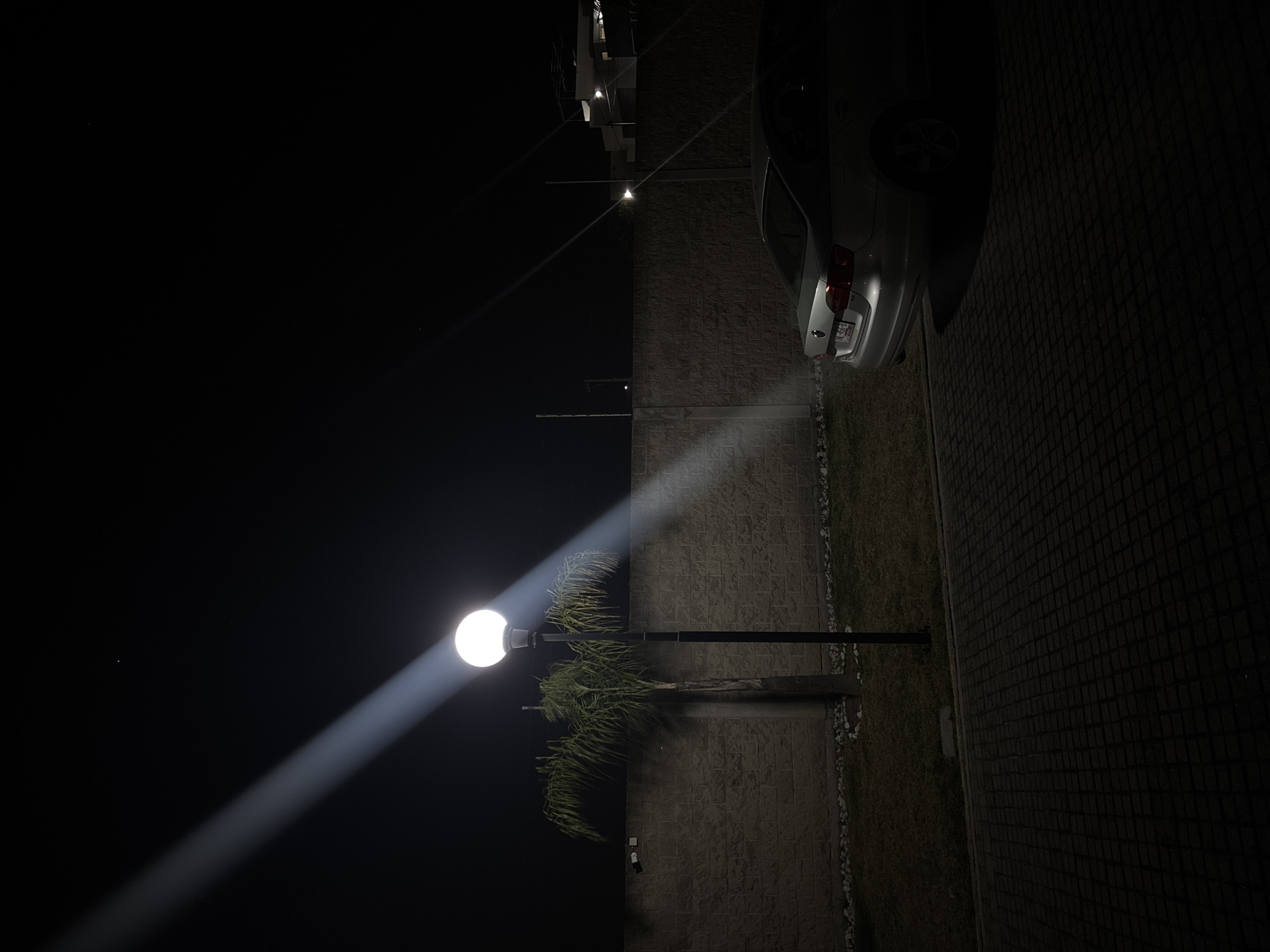 The scene depicts an outdoor nighttime environment in San Juan Cuautlancingo, Mexico. A brightly illuminated spherical streetlamp, mounted on a dark pole, stands prominently to the left of the image center, casting a distinct diagonal beam of light upwards into the dark sky. To the left of the streetlamp, a single palm tree is positioned against a textured concrete block wall. White decorative rocks are arranged at the base of this wall near the palm tree. A dark security camera is mounted on the wall to the left of the palm tree. The lower portion of the image features a dark, patterned paved surface, likely constructed of pavers or cobblestones. Adjacent to this pavement on the left is a patch of dark grass. On the right side of the image, a silver sedan, identifiable as a Volkswagen Jetta, is parked with its rear section visible, partially on the paved surface and partially on the adjacent grass. The license plate "NLE-51-69" is legible on the vehicle's rear. The concrete block wall extends horizontally across the midground. Beyond this wall, in the darker background, the silhouette of a building with a flat roof and several rooftop structures is discernible. Faint ambient light sources are visible in the distance beyond the wall, emanating from structures or utility poles. The sky is dark, with minimal visible stars, further emphasizing the nighttime setting. No individuals or overt actions are present in the scene.