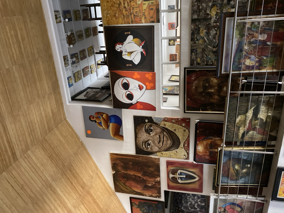 This image depicts the interior of an art gallery or exhibition space located in Ikate, Nigeria. The scene is dominated by a dense display of numerous artworks on white walls and stacked on surfaces. The ceiling on the upper left is slanted, constructed from light-toned wooden planks arranged in a pattern. The walls are predominantly white, serving as a backdrop for the diverse collection of paintings. Prominently featured artworks include: * A vertical painting of two figures with warm, muted tones on the upper left. * Below that, a painting featuring a smiling figure with dark skin and a patterned collar. * Above the smiling figure, a square painting of a seated woman in blue and brown against a gray background with an orange dot. * To the right, a vertical painting of a stylized face with large white eyes and red pupils, set against an orange and white background. * Adjacent to it, a square painting with a stylized seated figure in yellow and red on a black background, marked with "1 1". * To the far right, a painting depicting a sprawling cityscape or village with numerous structures featuring orange roofs. * In the lower section of the wall, a horizontal portrait of an individual with a head covering in dark, rich tones. * Further right, a textured painting with an abstract quality, possibly depicting an urban scene or market. * Below the large stylized face, a series of small, square, recessed windows or display niches reflect parts of the room and other artworks. A polished silver-colored metal railing with multiple horizontal bars runs across the lower foreground, suggesting a mezzanine level, staircase, or barrier within the space. Behind this railing, additional paintings are visible, including several dark portraits and a colorful group scene. An opening at the top right reveals a reflection of a white ceiling adorned with multiple smaller framed artworks. No individuals are present in the immediate foreground, nor are there any discernible interactions. The environment is well-lit, possibly by a combination of natural and artificial light.