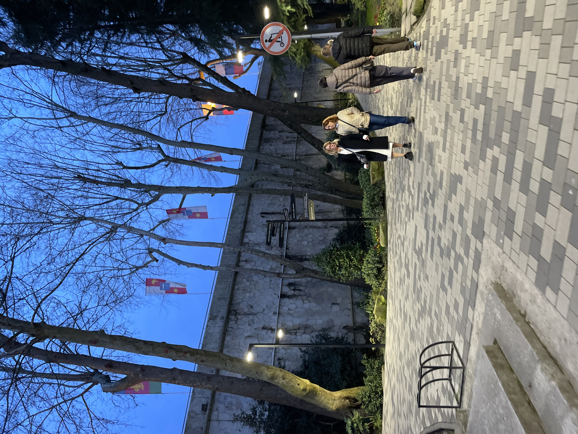 Captured at dusk in Sochi, Russia, the image depicts a pedestrian walkway lined with bare trees decorated with national flags. A stone wall runs parallel to the path. Pedestrians stroll along the walkway, including a group of four people and a pair walking side-by-side. Street lamps illuminate the scene. A 'no scooter' sign is visible. The walkway is paved with interlocking grey and white blocks. A small, arched metal structure sits at the edge of the path, near a bench.