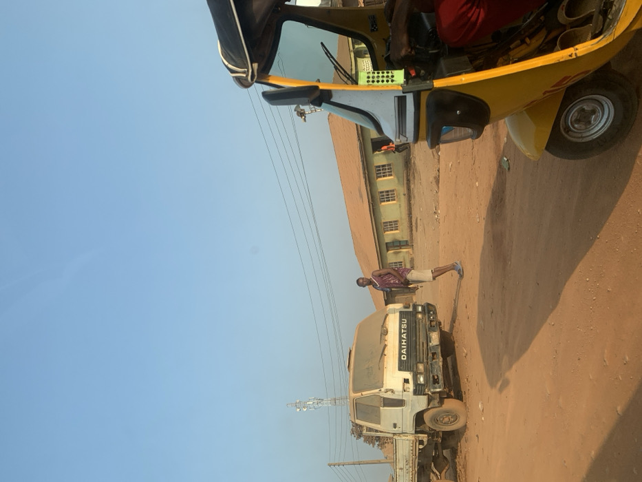 A sunny outdoor scene shows a dirt road with a yellow auto rickshaw at the top right and a weathered Daihatsu truck below it