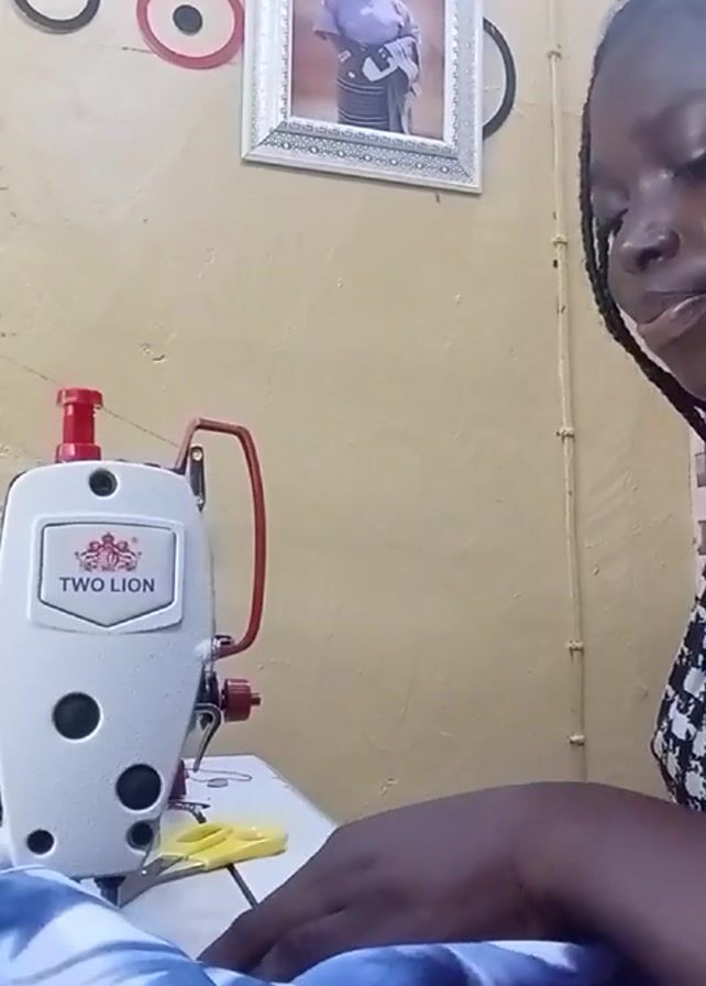 A young Black woman with braids is sewing on a white “TWO LION” sewing machine