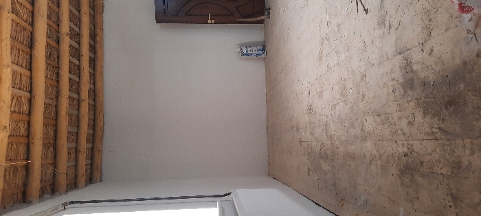 An indoor room, location Unknown, Unknown, is depicted from a low-angle perspective. The ceiling features exposed, horizontally laid wooden beams with a textured, possibly woven reed or thatch material visible between them. The walls are painted a uniform light gray or off-white. On the left wall, a white window frame is visible, with a dark vertical element, possibly a cable or pipe, running alongside it. The floor is composed of light brown wooden planks, heavily soiled and discolored with dark stains and scattered debris. Against the back wall, to the right of center, a tall, cylindrical white and blue object, resembling a bag of construction material, rests upright. A dark brown wooden door with a brass-colored handle and a decorative carved panel design is partially visible on the right wall. No individuals are present.