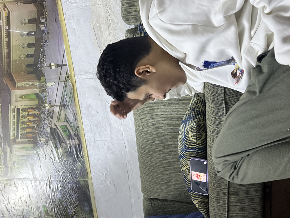 A person with dark, short, curly hair wearing a white hoodie and green pants is sitting on a striped couch, looking down at a phone. The phone is positioned between the person and a patterned cushion. Behind the person is a wall with a large poster of a building, possibly a mosque or temple complex. The poster appears to be slightly askew on the wall.