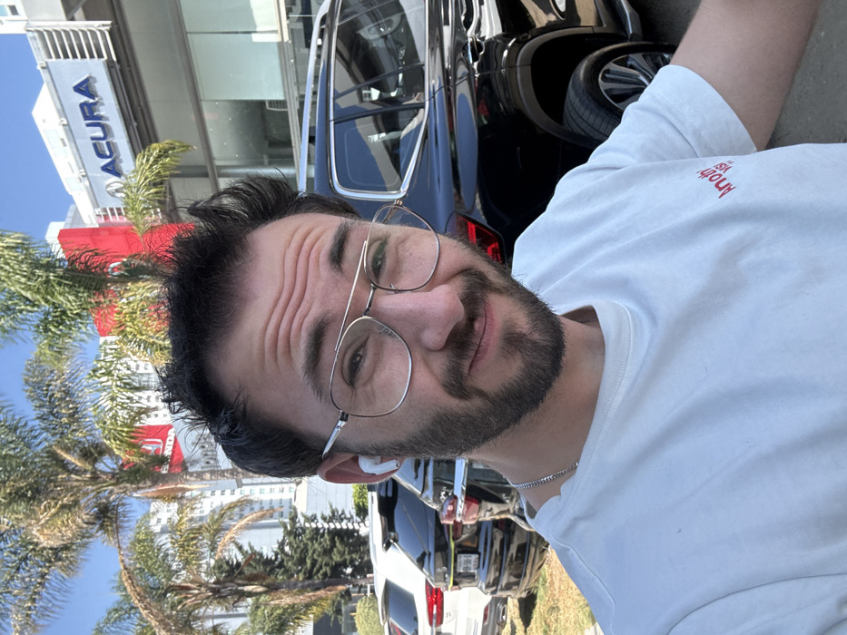 The scene depicts a male subject outdoors, capturing a selfie-style photograph. The location is identified as being near the Honda and Acura dealerships at Avenida Jesús del Monte 35, Hacienda de las Palmas, 52763 Huixquilucan de Degollado, Méx., Mexico. **People:** A single adult male, appearing to be in his 20s or 30s, is positioned in the foreground, facing the camera directly. He has short, dark, wavy hair and a trimmed beard. He wears eyeglasses with thin, possibly silver, metal frames featuring a double bridge. A white earbud is inserted into his left ear. He is dressed in a plain white short-sleeved t-shirt with red text, partially visible, on the upper right side of the garment. His expression is a slight smile. His left arm is extended, indicating he is holding the camera. **Objects and Environment:** The background features a clear blue sky and several palm trees. To the subject's immediate right, a dark-colored SUV is parked. Behind him and slightly to his left, another dark vehicle is visible, across the rear of which a yellow barrier or tape is stretched. A white SUV is also visible further back in the parking area. In the mid-ground, two car dealership buildings are identifiable: a red structure with a white "HONDA" logo is visible on the left, and a contemporary glass-fronted building with a prominent silver "ACURA" sign is visible on the right. Tall, multi-story buildings are discernible in the far background, suggesting an urban or suburban setting. The lighting is bright, consistent with a sunny day.