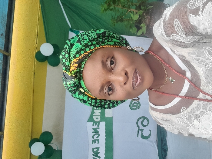 This image depicts an adult female in the city of Ajah, Nigeria. She is presented in a headshot-style portrait, looking directly at the camera with a composed expression. The subject has light brown skin, dark eyes, and a nose piercing on her left nostril. She wears a vibrant green, black, and orange patterned headwrap. Her attire includes a white, sheer lace top, a gold-colored chain necklace with a small dark pendant, a longer necklace composed of reddish-brown cylindrical beads, and large, ornate, silver-toned hoop earrings. The background features event decorations. Visible elements include a horizontal yellow beam at the top, a white band below it, and a white fabric banner with reversed green lettering, reading 'YAD ECNEDNEP' (suggesting 'INDEPENDENCE DAY'). Two clusters of balloons, each comprising three green and one white balloon, are visible in the upper corners. A potted green plant is situated to the subject's right, with additional green fabric draped further right.