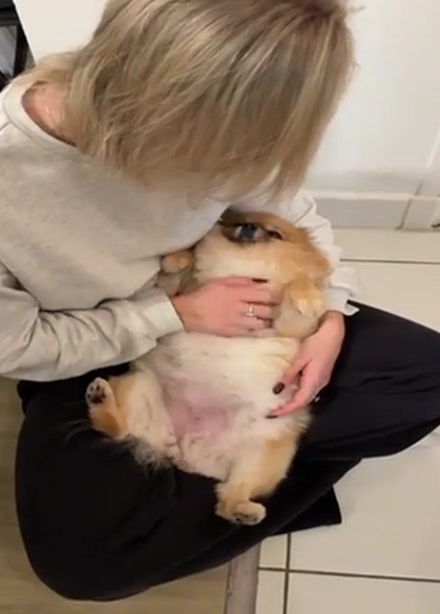 A woman with short blonde hair sits with her legs crossed on a white tile floor. She is wearing a gray sweatshirt and black pants. She holds a small, tan Pomeranian dog on its back in her lap. The dog's belly is exposed, and the woman gently pets its belly. The woman's face is close to the dog's, and she appears to be talking to it. A white cabinet is visible in the background.