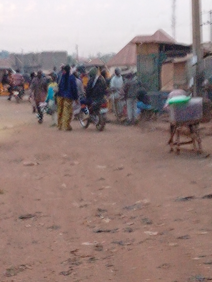 A slightly blurry image shows a busy, possibly outdoor market scene. People mill about, some standing near motorcycles. A small building with a reddish roof and green sides is visible on the right. Utility poles reach into the sky in the background. The ground is dusty and uneven, suggesting a dirt road. The lighting is muted, possibly from an overcast sky.