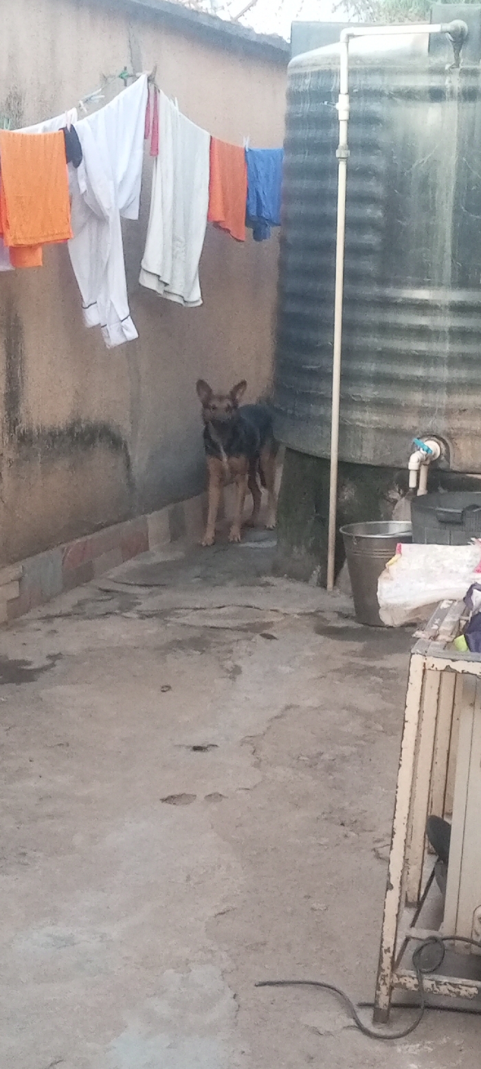 A medium-sized dog stands in a corner between a water tank and a wall with clothes hanging on a line. The dog is mostly brown and black with erect ears and appears to be staring at the viewer. The ground is a textured concrete. In the foreground is a metal frame structure with a few items on it. A garden hose lies on the ground near the structure.