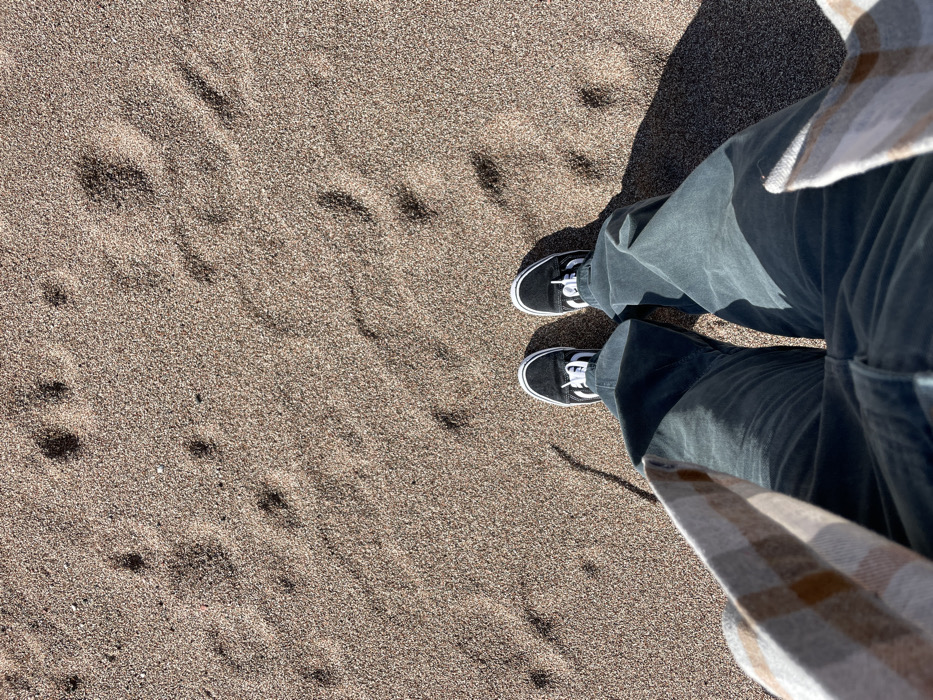 - "The image displays a downward-facing perspective of a person standing on a sandy beach in Bečići, Montenegro" by FM-GgSpJ3, licensed under CC BY 4.0
