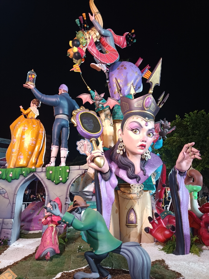 An elaborate, multi-tiered artistic installation, likely a Fallas monument, is depicted at night in El Port De Sagunt, Spain