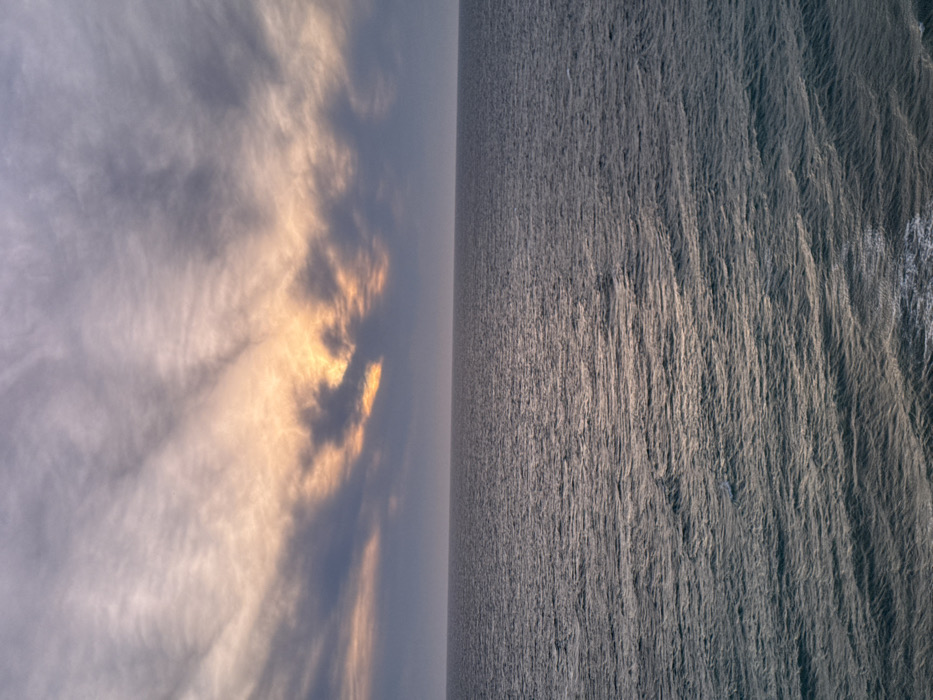 The scene depicts an expansive seascape observed from Anapa, Russia, overlooking the Black Sea. A flat horizon line bisects the image. The upper portion of the frame shows a sky at dawn or dusk, characterized by a complex formation of dark grey and blue clouds. A prominent, bright orange-yellow light source, presumed to be the sun, is partially visible through a break in these clouds, casting visible rays upward and outward. Areas of the sky are subtly illuminated with pink and purple hues, particularly amongst higher, wispy cloud formations. The lower portion of the image features the dark blue-grey surface of the sea, exhibiting numerous ripples and small waves across its expanse. A faint, elongated reflection of the sky's light is discernible on the water's surface. A small patch of white foam or breaking surf is present at the bottom right corner of the frame. No individuals, watercraft, or man-made structures are visible in the scene.