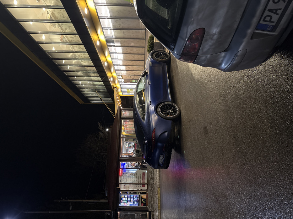 A nighttime scene in Radilovo, Bulgaria, depicts a commercial area with wet asphalt pavement reflecting artificial light sources. In the immediate foreground, positioned to the right, is the rear section of a silver hatchback vehicle with a partially visible Bulgarian license plate displaying "BG PA". Behind it, to the left of center, is a dark blue (possibly matte finish) Mercedes-AMG GT 4-Door Coupe, parked with its rear facing the viewer. Its Bulgarian license plate "CB 4363 TB" is clearly visible. In the background, two distinct commercial structures are present. To the left, a single-story kiosk-style building with a red-brown roof features large glass windows displaying various retail items. An illuminated vending machine is affixed to its exterior left wall. Inside this kiosk, multiple indistinct human figures are visible, engaged in what appears to be commercial activity. To the right, a larger, multi-story modern building stands with a facade characterized by numerous illuminated windows, some revealing interior spaces. The lower section of this building is accented with prominent yellow lighting along its facade and beneath an awning. The sky above is dark, with bare tree branches visible against it on the left side of the frame.