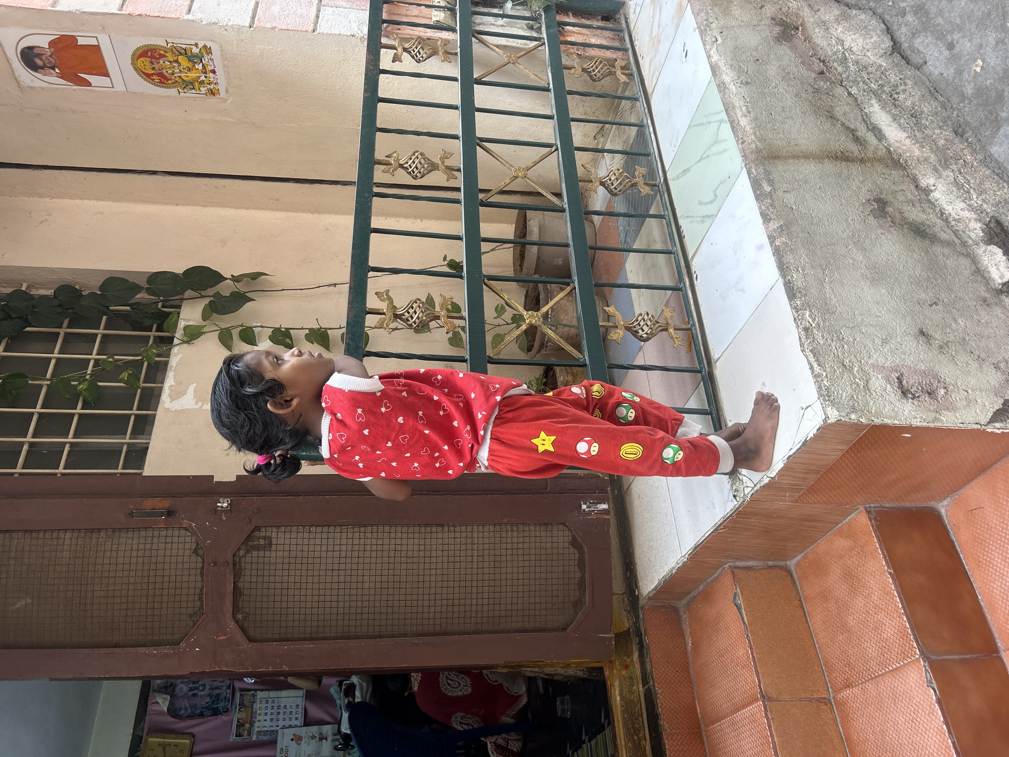 A young child, appearing to be Indian, stands barefoot on a tiled landing outside a building in Puttaparthi, India