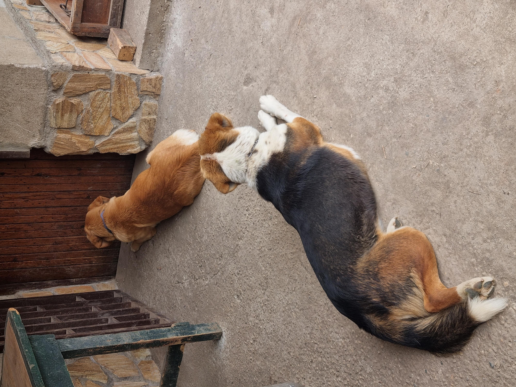 Two dogs are lying on a concrete surface in Galabovtsi, Bulgaria. One dog is light brown, wearing a purple collar, and positioned near a brown wooden gate and a grate. The second dog, black, white, and brown, rests with its head near the first dog's rear, its tail extended, showing white-tipped fur. A stone wall is visible to the left of the brown gate.