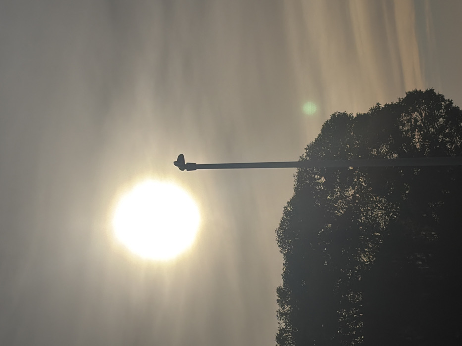 A silhouetted tree stands to the right. The sun is a bright, hazy circle to the left. A slender pole extends horizontally between the tree and the sun, ending in a small fitting. The scene is washed in a soft, muted light, with a predominantly gray and golden hue. The sky above suggests a misty or overcast day.