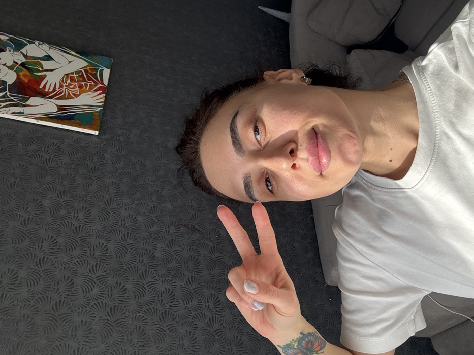 The image displays a single individual, a woman, captured in what appears to be an indoor residential or private setting within Tbilisi, Georgia. The woman is positioned in the lower portion of the frame, facing forward with a subtle smile. She has dark hair, styled off her face, and prominent eyebrows. Her skin shows areas of bright illumination, consistent with strong natural light, likely sunlight, particularly on the right side of her face and shoulder. She is wearing a plain white crew-neck t-shirt. Her left hand is raised to her left, forming a "peace" sign (V-sign) with her index and middle fingers extended. Her fingernails have a light-colored polish. A multi-colored butterfly tattoo is visible on her left forearm, near the wrist. A small, metallic hoop earring is visible in her right ear. The background features a dark gray wall adorned with a repetitive, textured pattern of stylized, fan-like or shell shapes. In the upper right quadrant of the frame, a rectangular piece of artwork is mounted on the wall. This artwork consists of stylized white outlines of two figures, possibly embracing, against a vibrant background of vertical, multi-colored stripes. Partially visible behind the woman to her right and left is a light-colored, upholstered sofa or couch. A white cable or cord is visible on the sofa to her left. No specific external landmarks or architectural details are present to identify a precise location within the city of Tbilisi beyond a general indoor environment.