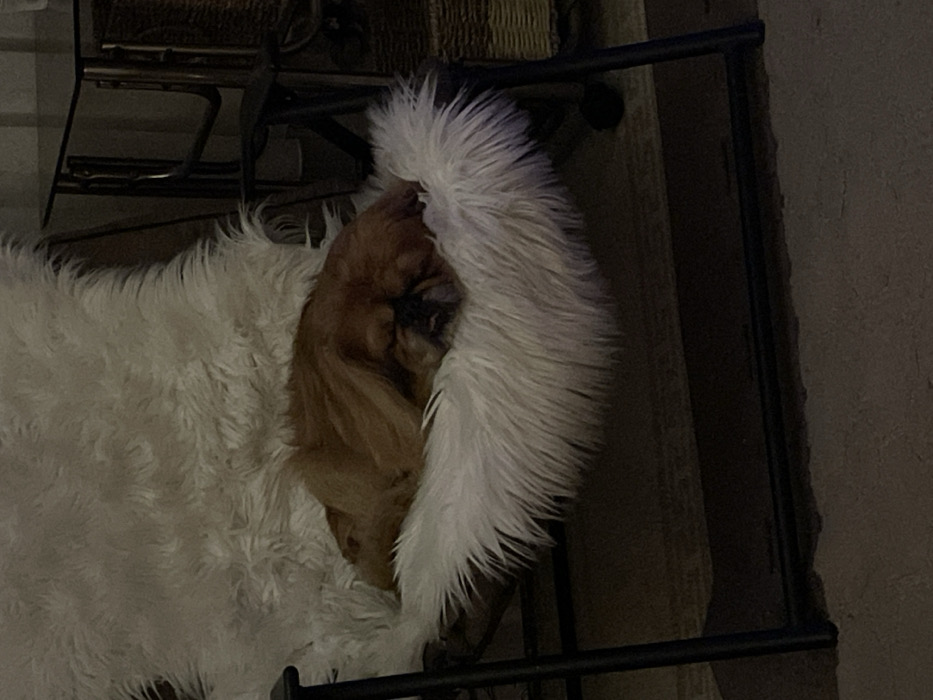 An indoor scene in the city of Troyan, Bulgaria, depicts a light brown dog resting on a chair in dim lighting. The dog, appearing to be a Pekingese or similar breed with long fur, is curled up asleep on a white, shaggy faux fur cushion that covers the seat and back of a dark-framed folding chair. To the right of the chair, a portion of a small, dark-framed table with a clear glass top is visible, along with a woven wicker object, possibly a basket or furniture piece. The overall environment is dimly illuminated, suggesting an evening or night setting. No human subjects are present.