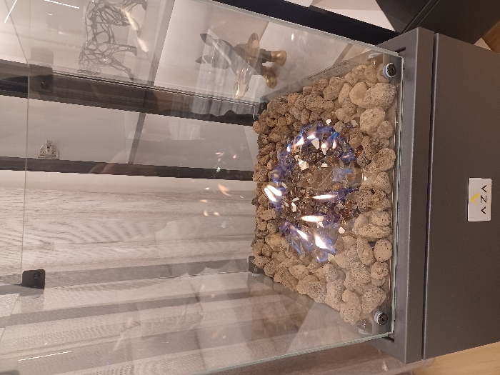 This image depicts an indoor scene in Dahiyat Qudsaiya, Syria. A modern, dark grey, square-based gas fire pit, enclosed by clear glass panels, occupies the foreground. Inside the glass enclosure, light brown pebbles encircle a central arrangement of dark, reflective fire glass from which active blue and yellow flames rise. A circular control knob is visible on the upper left edge of the fire pit's base. The front of the base bears a white rectangular label with the text "AZA" and an associated triangular logo. The background, partially obscured by reflections in the glass, includes light-colored vertical window blinds to the left and a display cabinet to the right. Within the cabinet, a metallic open-work sculpture resembling a feline rests on an upper shelf, and a gold-colored dog figurine holding a tray is positioned on a lower shelf. The flooring beneath the unit appears to be a light-toned wood.