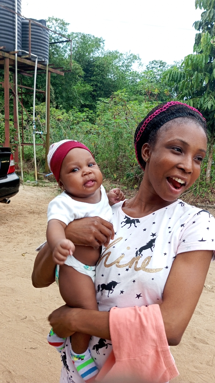 The image depicts an adult female holding an infant outdoors
