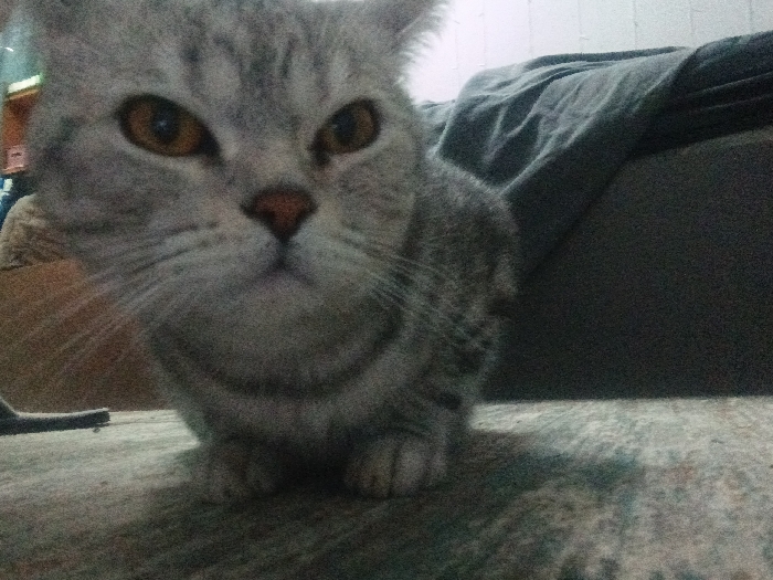An indoor photograph, captured at a low angle, depicts a grey-silver tabby cat with prominent amber eyes staring directly at the viewer