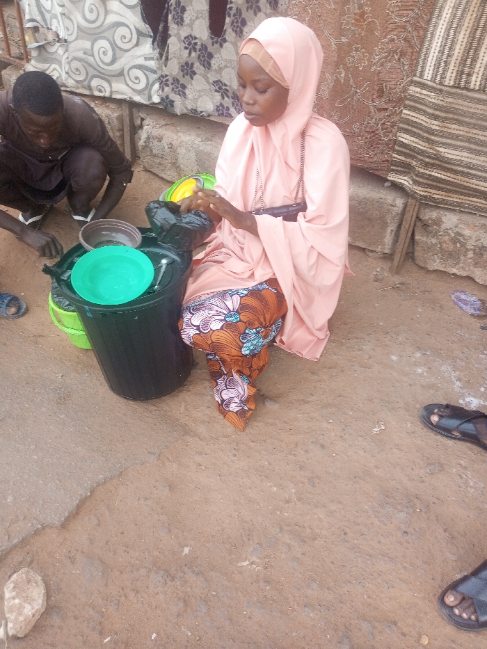 An outdoor scene in Birnin Kebbi, Nigeria, depicts two individuals and various objects on a dirt and concrete ground surface