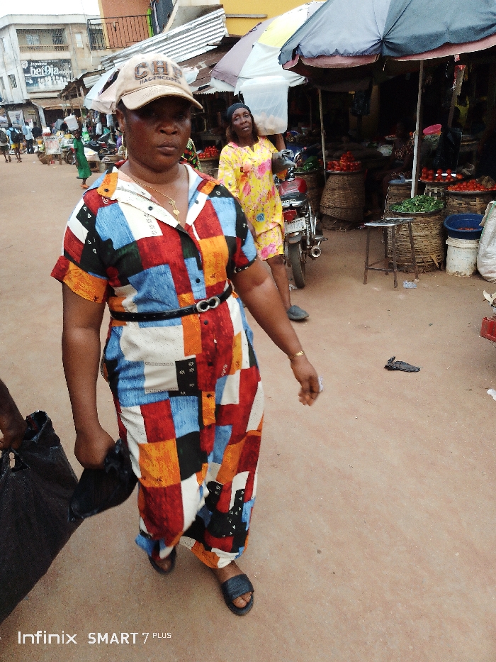 A woman in a multicolored patchwork dress and baseball cap walks towards the camera, carrying a black bag. She is wearing a black belt with a double circle buckle and dark sandals. Behind her, a woman in a yellow floral dress stands near a parked motorbike and market stalls shaded by umbrellas. Baskets of tomatoes and greens are visible on the stalls. The setting appears to be a bustling outdoor market.