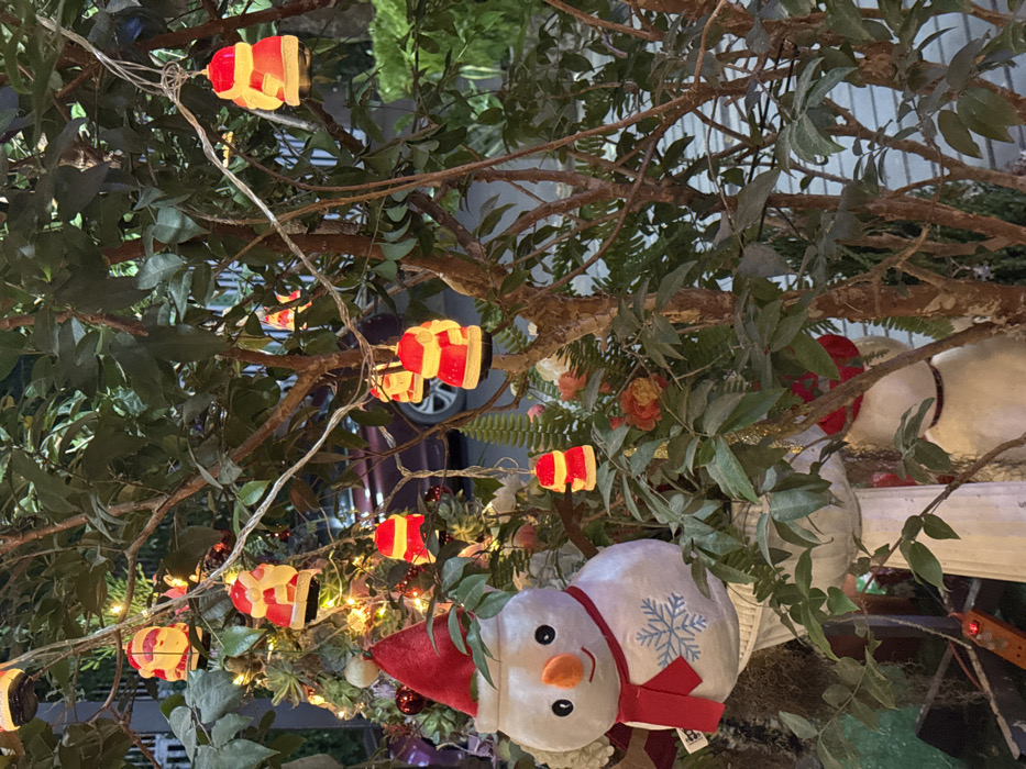 The scene depicts an outdoor nighttime view of Christmas decorations interspersed among natural foliage in Buôn Ma Thuột, Vietnam. Multiple strands of illuminated string lights, featuring plastic Santa Claus head figures and generic red and yellow stacked shapes, are strung through the branches of several trees and bushes with green leaves. In the lower-left foreground, a white plush snowman, wearing a red pointed hat, an orange nose, black dot eyes, and a red scarf with a light blue snowflake emblem, is situated on a white fluted pedestal. Part of a second plush snowman, similarly adorned, is partially visible behind the foreground elements. Behind the decorated foliage, a dark-colored vehicle, likely a car, is partially visible, with its front wheel and part of its body discernible on what appears to be a street or driveway. The background also shows indistinct structural elements and additional green plants.